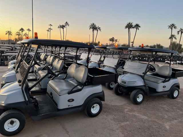 Platinum bodies, black tops & seats. Equipped with brand new batteries, cargo boxes, tires, windshields, mirrors, & safety lights.