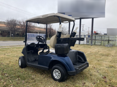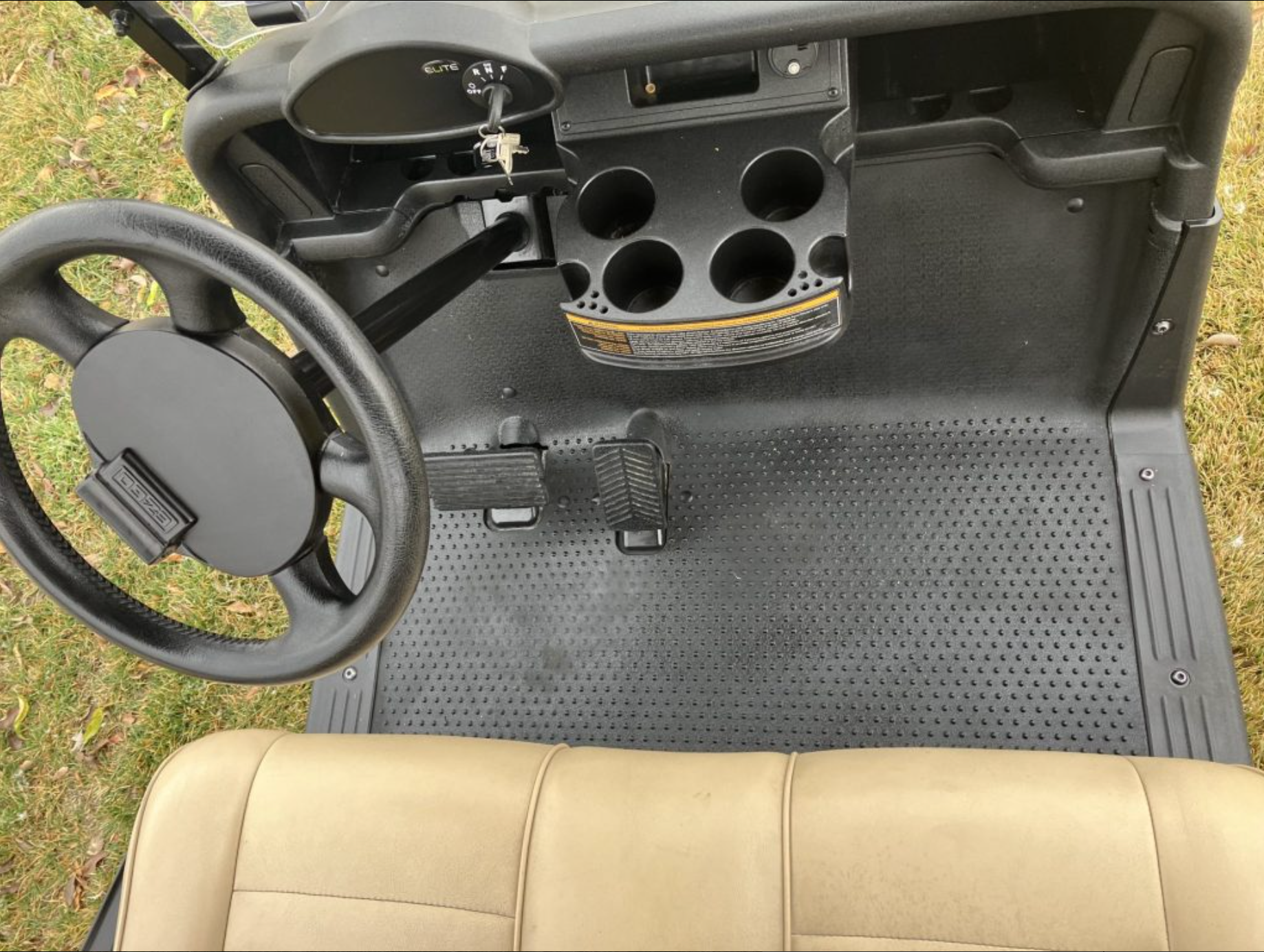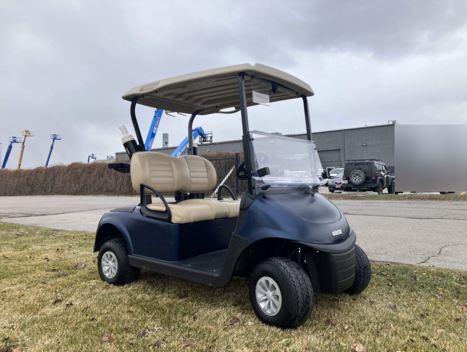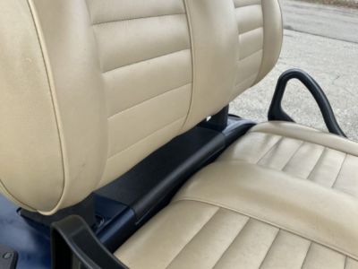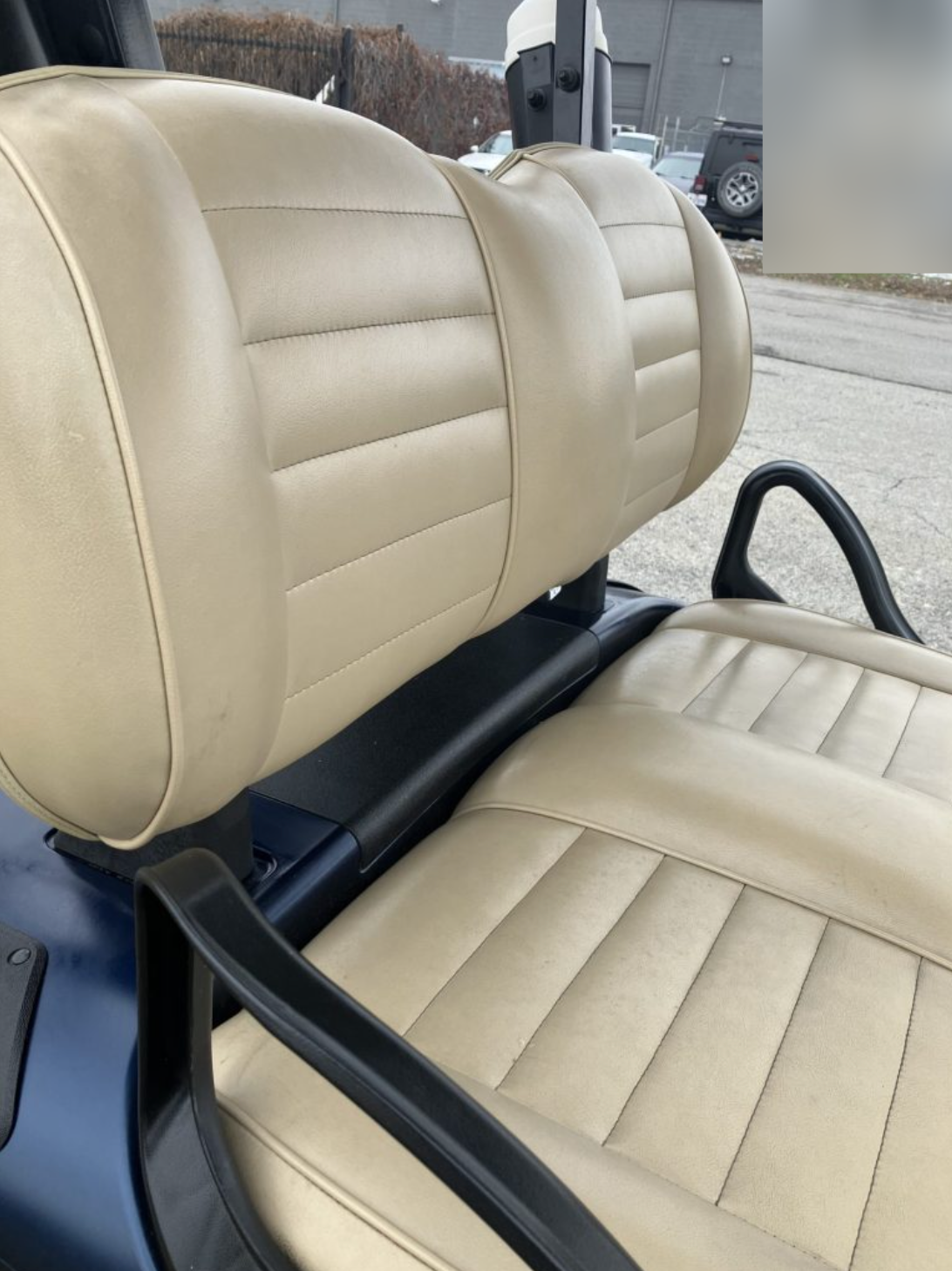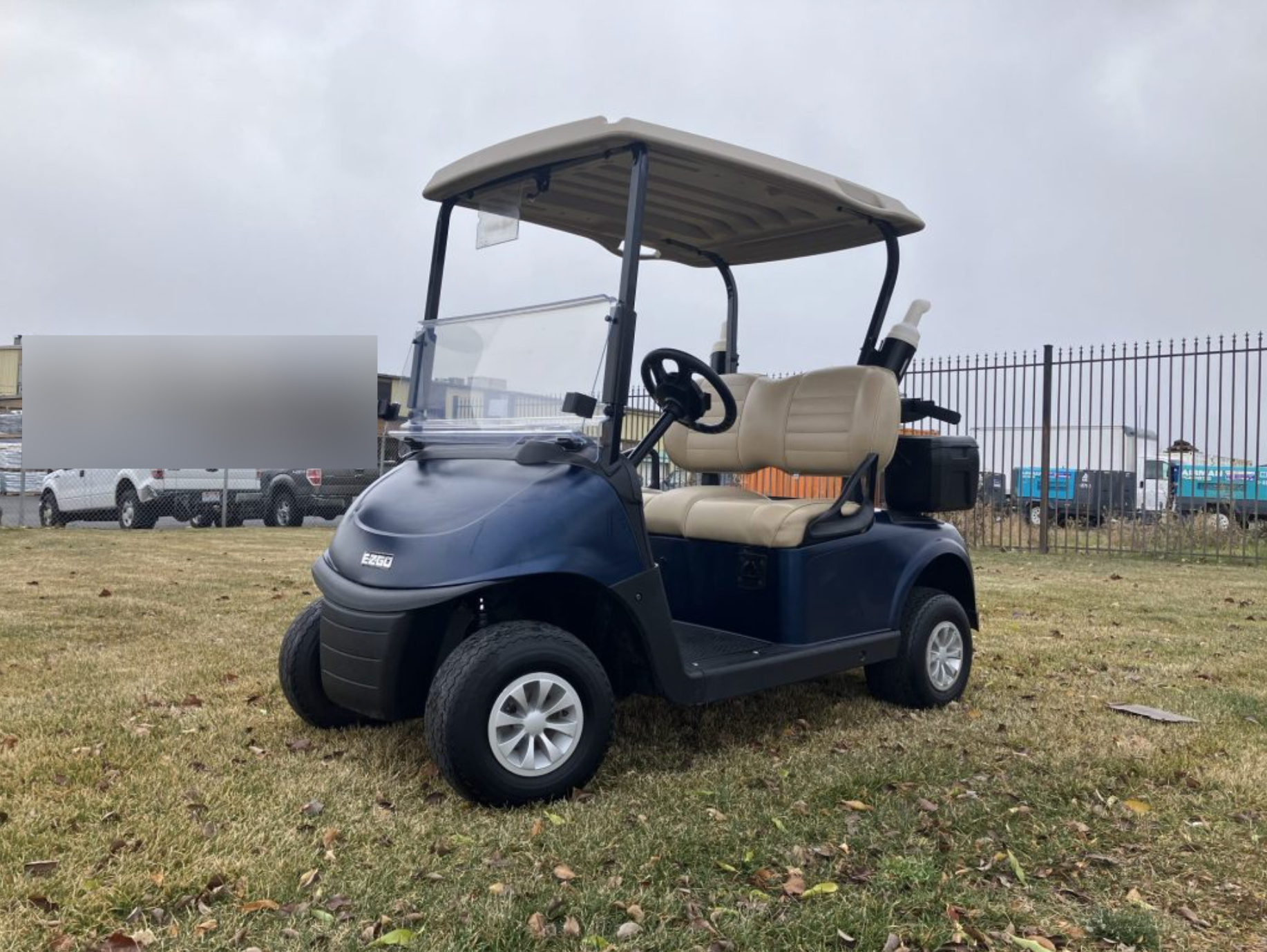 Notes: Premium matte blue bodies, beige tops, and premium beige seats with small visible tears. Includes windshields, sand bottle, USB port, and EZGO cooler. Average condition.