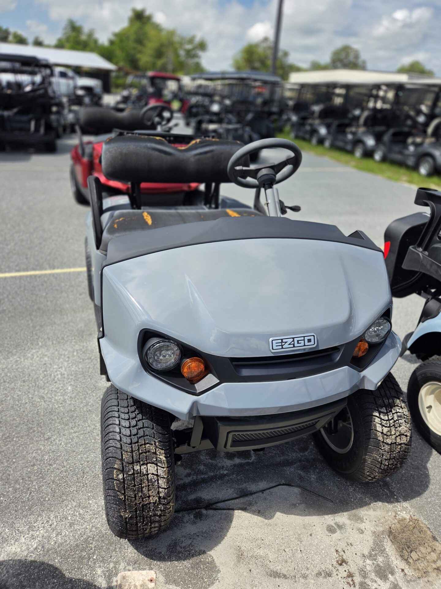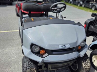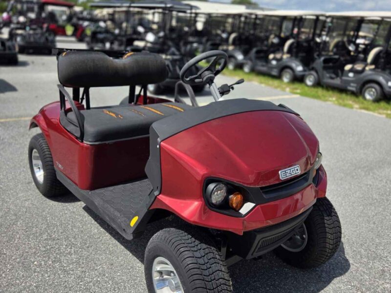 Gray and red bodies with black tops, seats, and uprights. Never used but requires new batteries and seats. Equipped with headlights.
