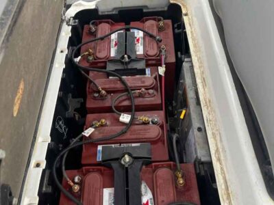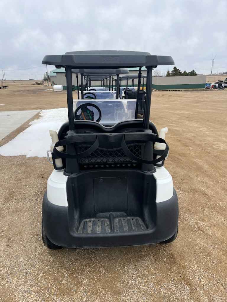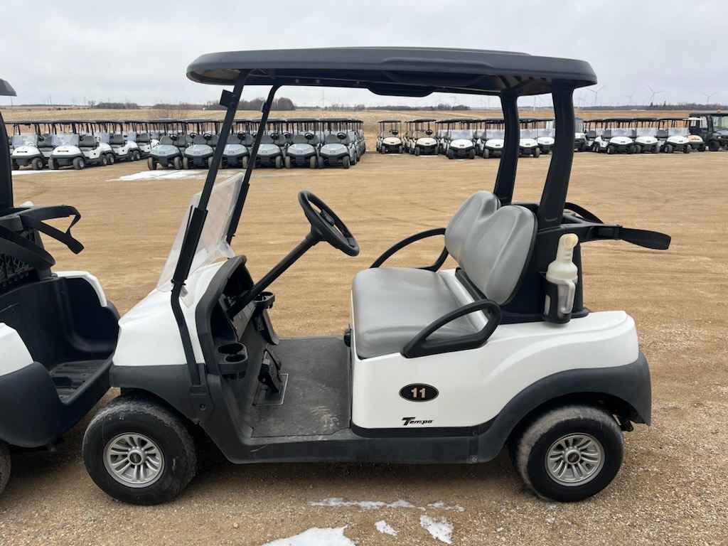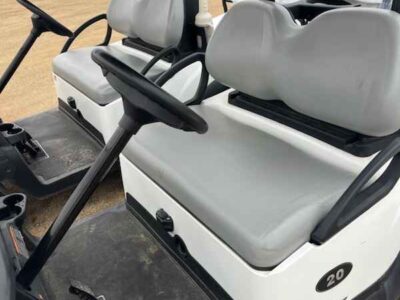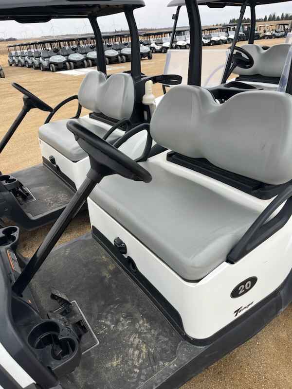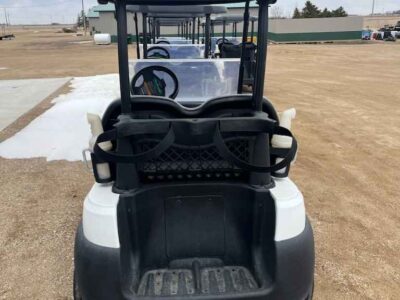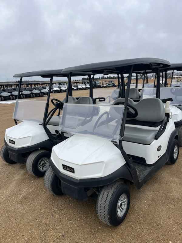 Notes: White bodies, black tops, and gray seats. Equipped with windshields and original batteries with SPWS included. Nice late model electrics for builders or to clean up and resale. Club Car decal/adhesive peeling on some, and would need to be replaced.